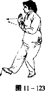 撤左脚,后移重心,右手平着向右、向后收于肩前,重心前移 跟左脚,两手心向外,一齐推出,目视右手食指(图11-124)。