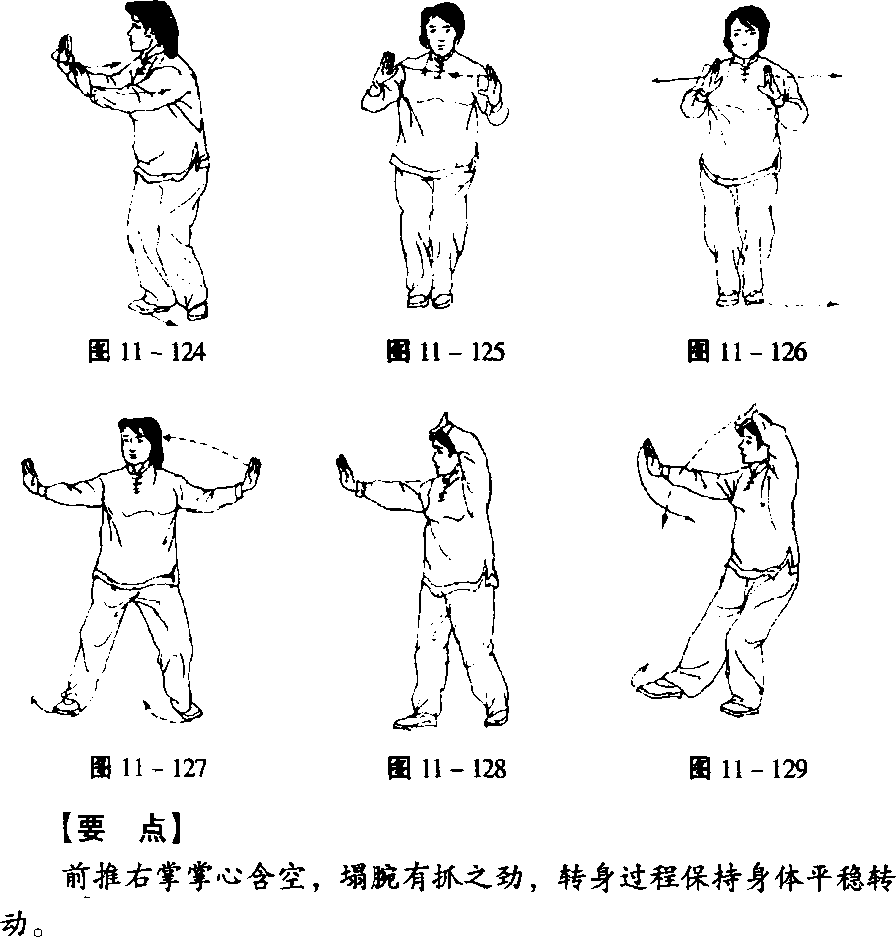 移,右脚外摆,脚尖向前,同时,左手往上,向右划弧至手背贴住 前额,身体右转,右掌塌腕不动,目视右手食指(图11-128、 129) 〇