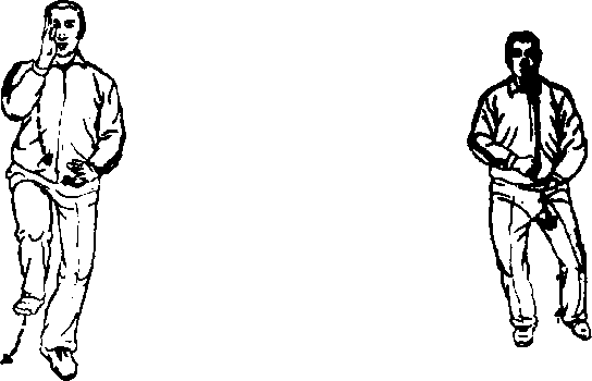 按:右脚蹬地,提膝向前高与胯平,脚掌平,脚心正对地面, 脚尖向前,成左腿独立式。同时,右手转手心向左,弧形上提,高 与头平,右肘与右膝相对齐,左手向里经胸前下落至左胯根前,手 心斜向右下(图12-8)。