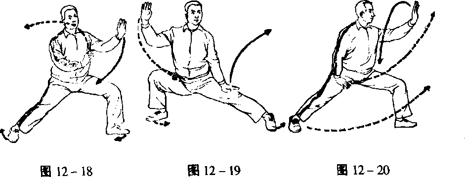 高与胯平。同时两手向前向下向左后方划圈,左手在身左侧,手腕 高与胯平,手心向下,右手落左腹前,手心斜向下。眼向东平视 m 12-24)0