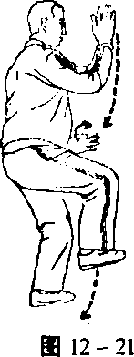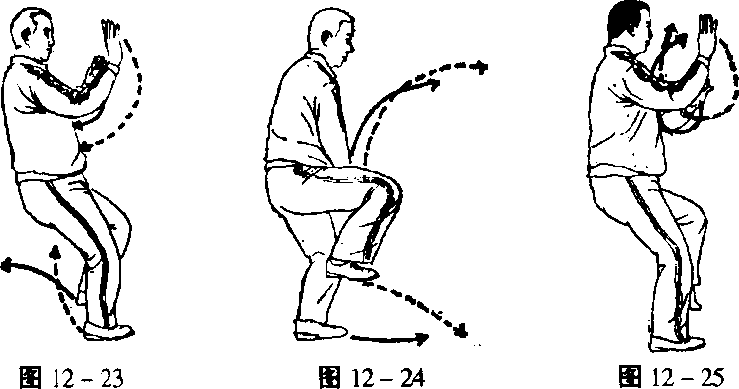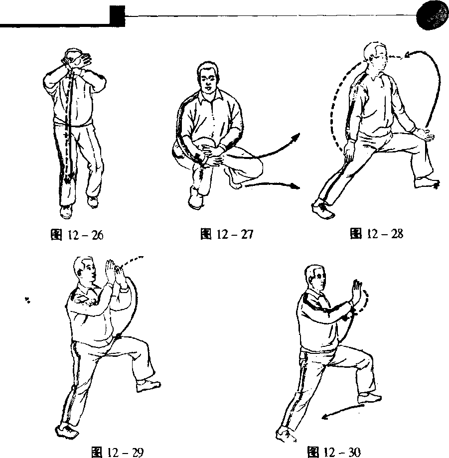双手再交叉成十字手,右脚尖内扣朝南偏东,重心在右脚,身 下蹲,十字手弧形落下在右膝前,眼向东南方向平视(图12- 27)。