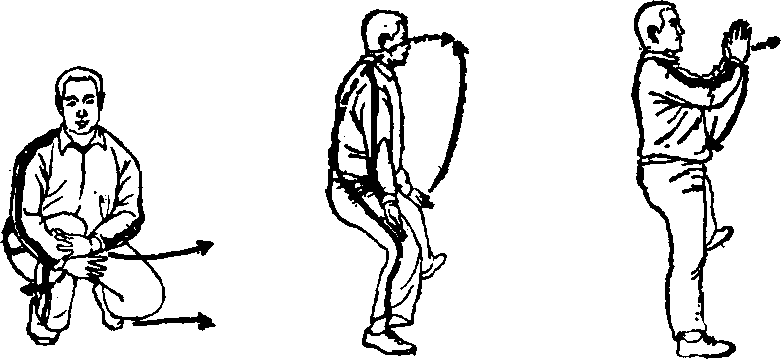 用法:对方用双手采洌我左手,并向前下按,我即变虚实以左 手下引,上抽右手迎面击出并身体下蹲,带动右手继续乘势按对方 肘臂或头颈等部位均可。