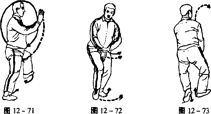 实,左脚提起跟上半步。同时,右臂内旋,手掌在裆前,手心向东 南,指尖向下。左手心向下,手向右推提至右肘前。眼向东北平视 (图 12-73)。