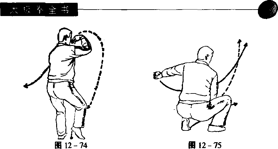 右腿变实下蹲,膝向东北,左脚虚点着地。同时,左手变勾手 弧形向西北方向提起,与肩平,勾尖对西南,手臂微曲。右手变立 掌外旋下按至右膝内侧,指尖向东北,小臂略低于膝,右肘贴在右 胯根处。身体下蹲时,身须中正。眼平视东北(图12-75)。