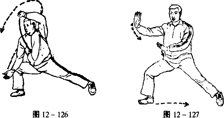 重心移到左腿,随即又移到右腿成弓蹬步。同时,右手向后、 向上缠头过脑按至西南方,高与鼻平,手心向西南,左手弧形下按 至胸腹前,手心向西。眼向西南平视(图12-127)。