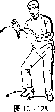 左脚收回即向左前方(西南)迈出一步,成左弓蹬步。同时, 左手由下经腹前向上、向左前方划圈按出,手心向西南,高与鼻 平。右手划圆弧下按到右胯根处,手心向下,眼向西南平视(图 12-137)。