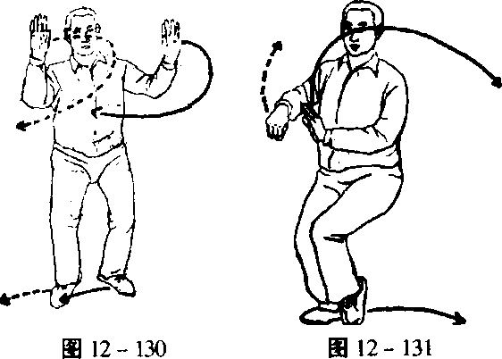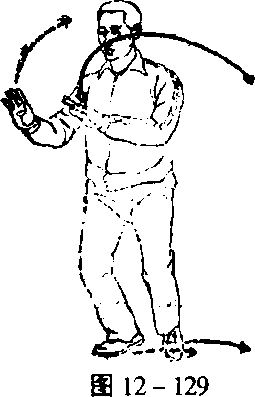 外旋。手心向里,再内旋上下分开,左手转手心朝外划圆弧向左前 按出,高与头平,右手转掌心向下、向右下划圆弧按至右腿外侧, 手心向外。眼向西平视(图12-135)。
