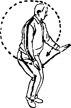 右脚撑地,身体上跃,右脚离地数寸即下踏,左脚在右脚踏地 后下踏,略出右脚变实,右脚提起,脚尖点地。同时左手随身弧形