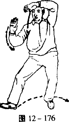 右腿变实,左脚向后、向西南退一步变实成仆步,右脚脚尖翘 起,左手向左、向上划圆弧到左额前,右手变立掌下按至右膝内 侧。眼看右脚尖方向(图12-174)。
