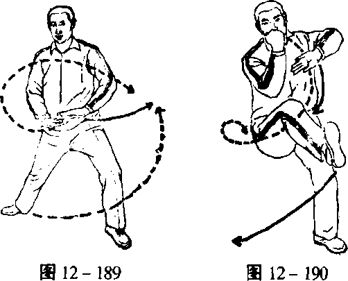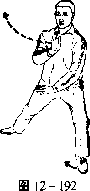 右脚以外侧向我左肘下外摆。同时左手拍右脚面,右手向下、 向后、向上经头顶变拳向左前打击,与右脚左手平,拳心向里。眼 向南平视(图12-190)。