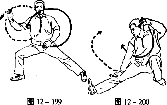 重心前移,右脚掌向前(西)踏实。同时,右手随身上提外旋 收回胸前,拳心向里。左手稍外旋转手心向前弧形向右肘下伸出 (图 12-201)。