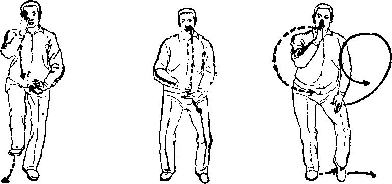 前,左手心向东南,右手划弧落至右膝内侧,手心斜向下。眼向右 —640 —