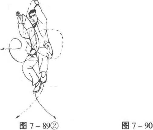 在上式转过280度以后,双手交叉合于胸前(图7-89?),接 着双拳变掌,分别向左右两侧弧形而上展开;同时,右足离地提 起,左足即蹬地跃起(图7-89②)。接着右足落于西南方,右足 随着落于东北方。双手自上双逆缠合于胸前,再顺缠而开,逆缠而 合,然后右拳打出,左拳收于左肋下(图7-90)。此式与前十七 式不同者仅有跃步动作,待两足落地后,即与其他几式“掩手肱 捶”相同。
