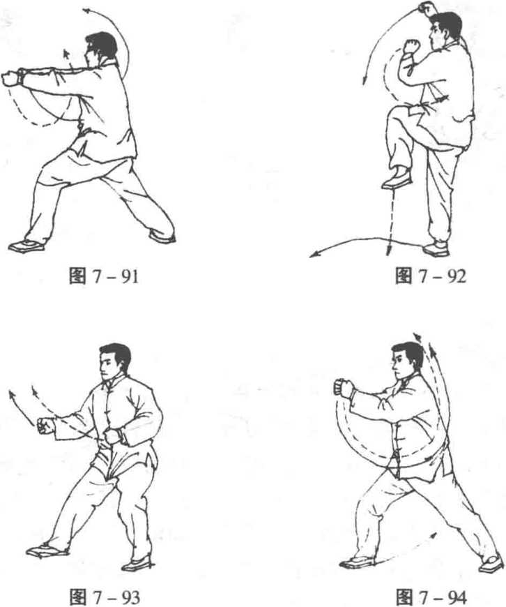 因动作是由右腿在前开始的,故名“右冲”。此式先是右腿在 前,最后换到左腿在前;双拳先从左肋侧转到右肋侧,划两个大圈 后抖出劲去;在这两点,此式与上一式正相反,因此它的动作路线 与上式是对称的(图7-95. 96、97)o