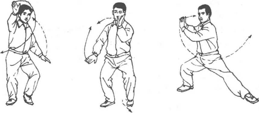 ② 此式是初次收回琵琶之意,要求运用右腿下挫后的弹性劲和 两手微小的左逆右顺的缠丝劲使身体旋转而上,成独立姿势。