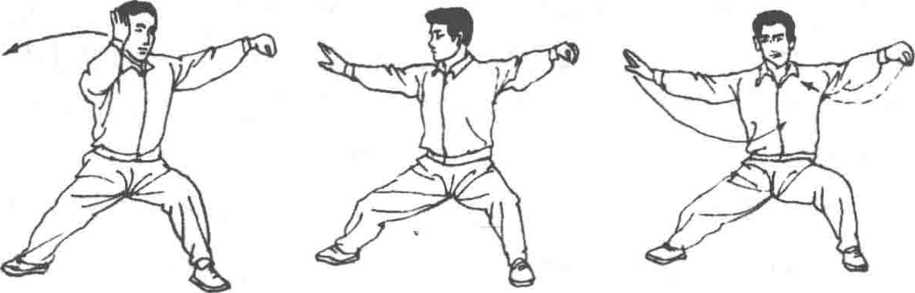 ③ 右掌缠经右耳旁的动力,要有来自左手成勾和弓左腿的感 觉。右掌经右耳旁转臂逆缠而出,要使脊背绷紧,产生气贴脊背的 功用。