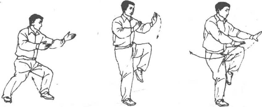 2.提膝收掌 身微右转并向右下挫,重心全部移于右腿,
