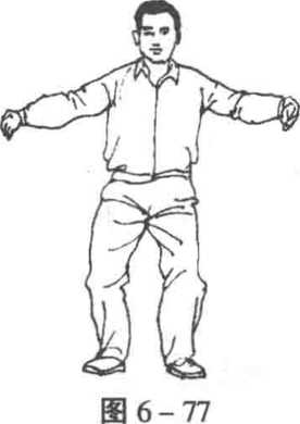 1 .擦脚合手 两手向左右逆缠展开,五指下垂,掌心朝内 (图6-77)。两手继续上举,转为顺缠,至高与肩平时,掌心翻朝 前上(图6-78)o重心全部移于左腿,右脚提起,即以脚跟向右 贴地铲出,随即重心右移,成马步;同时两手继续稍上举,即随右 脚右迈时向胸前顺缠交叉合拢,左掌在外,目视前方(图6-79. 80) o