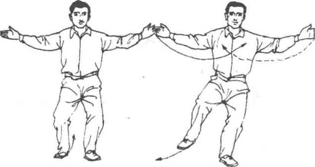 ① 此式是由上式金刚捣碓的合劲转为双逆的开劲,开后变双顺 缠,掌心转朝外的两手合劲,随即两手顺缠地交叉合拢;在这种平 开平合时,应注意两手的虚实与两足的虚实,尤其是手与足之间的 虚实。