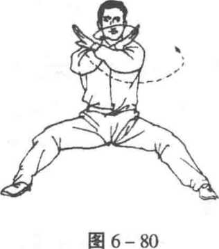2.马步横拳 两手变拳,右拳在面前自里向右逆缠而开, 即自右向前变顺缠而合,绕一整圈,拳心朝里;左手向左逆缠而 开,即变顺缠随右手合时微合,拳心朝右;在右手向右绕半圈时, 重心微右移,身微右转,当右手绕成一圈时,重心移回,身体转 正,目视右拳(图6-81)o