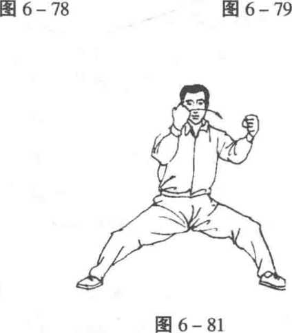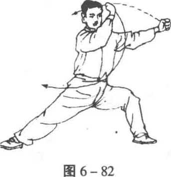 ② 动作2、3 (图6-81-83)是两掌变拳后的动作,须连贯为 一,要在气贴脊背和以腰为轴的要求下进行动作;其关键在于特别 扩大里外缠丝,并要以前一缠丝带领后一缠丝;只有这样,才能使 3个图式中的动作连而为一,并使内劲不丢,在毫无凹凸的情况中 变换过来。