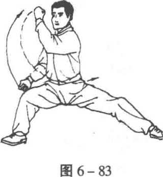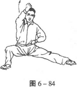 1 .折腰举拳 两胯跟下沉,身体左转折90度。同时,右手 逆缠,弧形上举,拳心朝左;左手转臂顺缠,左弧形下落于左腰 侧,拳心朝后(图6-84)o