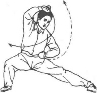 顺缠,右臂弯屈于头顶前;左拳在左腰侧作极小顺缠圈后,以拳面 紧贴于左腰部,随即身体微右转,以近右肩的背部向右后靠;同时 裆口更加下沉,眼视左脚面(图6-85)o