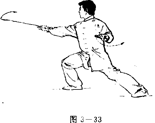 1 .收脚沉腕 重心前移,右脚收提于左脚内侧(不点 地);同时右手剑沉腕,手心斜向上,左剑指屈肘向前附于右前 臂上;目视剑尖方向(图3 — 32)。图 3 — 322 .弓步平斩 右脚向右后撤步,左脚尖内扣,右脚尖外 摆成右横裆步,身体右转约90度}同时右手握剑,向右平斩;左手剑指向左分展侧举,略低于胸,手心朝左,指尖朝前,目视 剑尖(图3 — 33)。