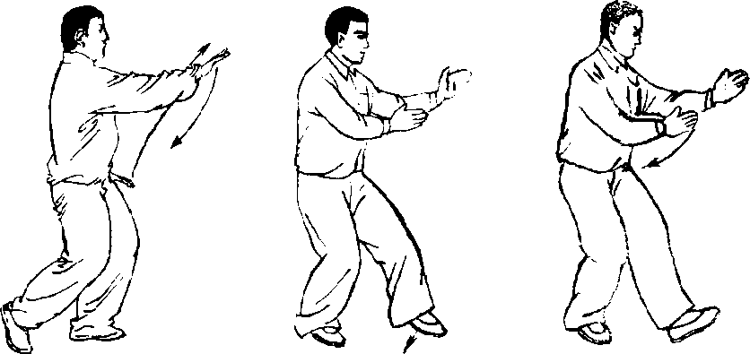 本势动作并不复杂,但初学者往往做得僵滞散乱,这主要 是忽略了“身法”,只是单纯模仿“手法”、“步法”的动作所造成 的。如本式两臂前摆,后引动作是由坐身右转来带动和协调 的;两臂的合劲和虚步的调整形成,是由身体向左回转来带动 和协调的。以下要学的诸拳式,亦都如此。