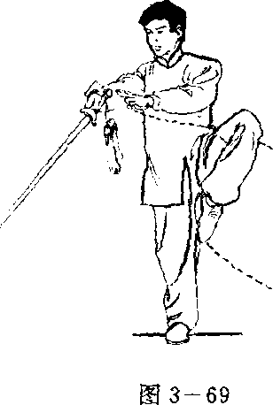 左脚屈膝成右独立步,上体微右转;同时右手剑经上向右 前下方点剑,剑尖同膝高,左剑指屈肘右摆附于右前臂内侧, 手心朝下;目视剑尖方向(图3 — 69)。【练习要点】点剑时上体不要倾斜。【攻防含义】点击由我右后方袭来之敌头或腕部。