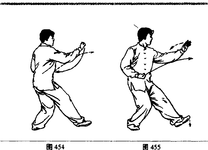 (2)身体重心移至左腿,上体微右转,右脚提起经左脚内 侧向右前方迈出,脚跟着地;同时右拳经胸前向前翻转撤出, 拳心向上;左手下落按于左胯旁,掌心向下,指尖向前;眼看右 拳(图454)。