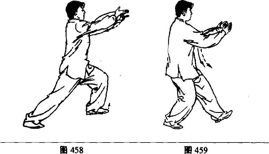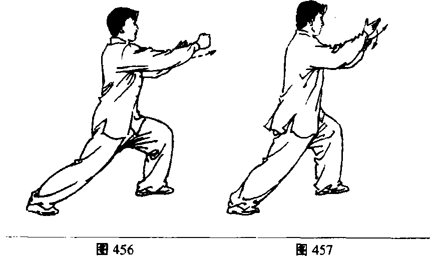 (1)上体慢慢后坐,身体重心移至右腿,左脚尖翘起;身 体左转、右腿屈膝以脚前掌蹬碾地面,左脚随身体左转向外 摆脚约45。,随后全脚踏实,左腿慢慢屈膝前弓;同时右掌变 拳,臂内旋向下、向左经腹前划弧至左肋旁,拳心向下;左掌向 前、向右划弧至胸前,掌心向下;眼看左掌(图452、453)。