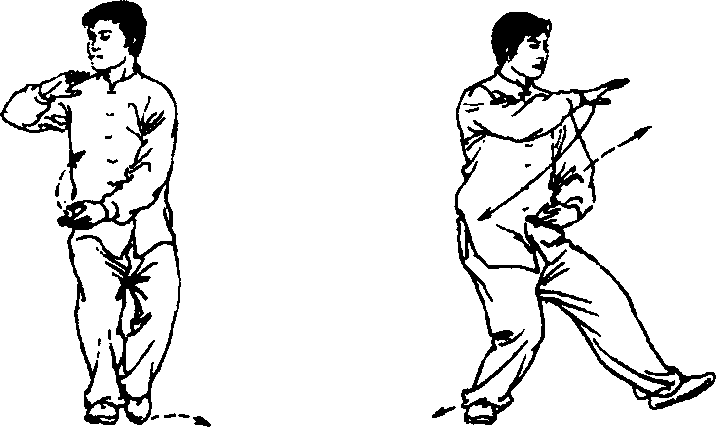 (2)转体上步——上体左转,左脚向左前方迈出一步,脚 跟轻轻着地,重心仍在右腿(图532)。