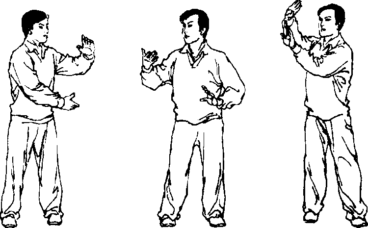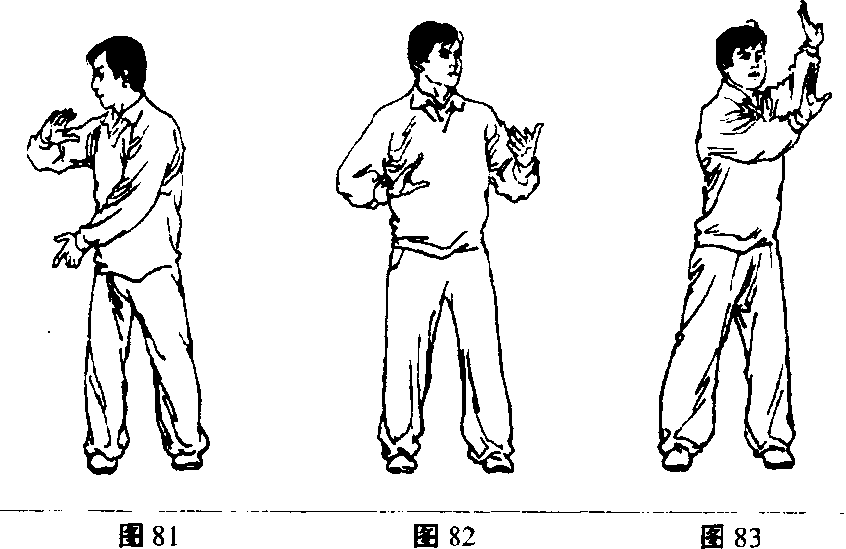 1 .上体右转,两臂屈收,两掌在右胸前“抱球”,同分靠势 抱球动作(图81)。