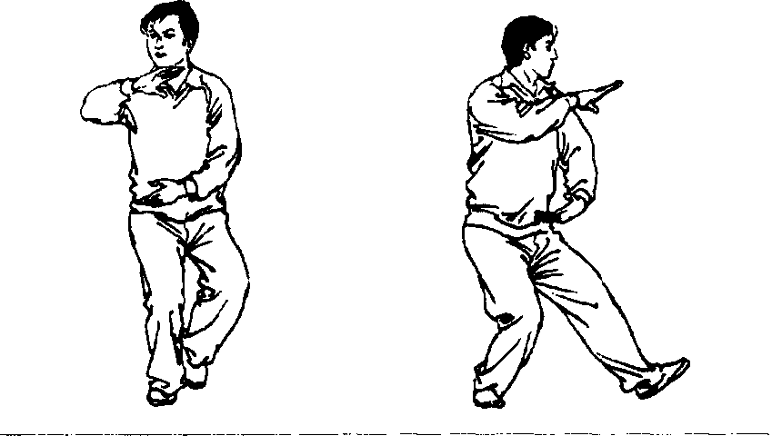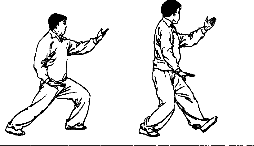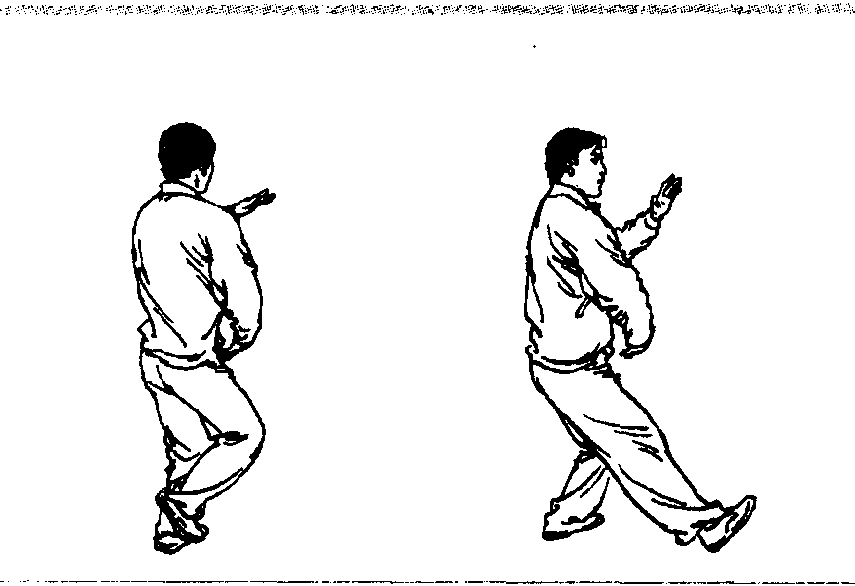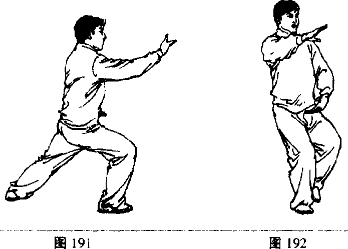 8 .右腿屈弓,左腿自然蹬直,成右弓步。两手前后分开如 “运臂”之抱分势(圈191)。