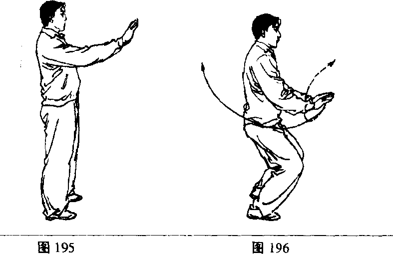 11 .收势时,后脚收拢半步与前脚齐平,两膝半屈,两脚 与肩同宽。两手前平举至肩前(图194)o然后身体徐徐起立, 两手下垂,左脚并拢还原。