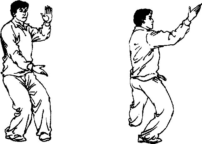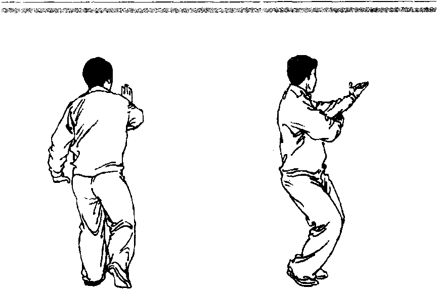 L上体左转,两腿屈蹲,重心右移,右脚尖内扣,右脚跟 提起。右手向下向右划弧摆动,手心翻转向上;左手向上、向右 划弧摆至右肩前(图205)。