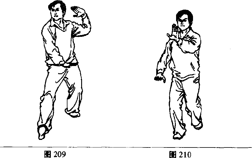 4 .重心稍后移,上体右后转,左脚尖内扣,右脚跟落地后 随之提起向内扭转。右手收至左肩前,右手向左上摆动(图 208 )0
