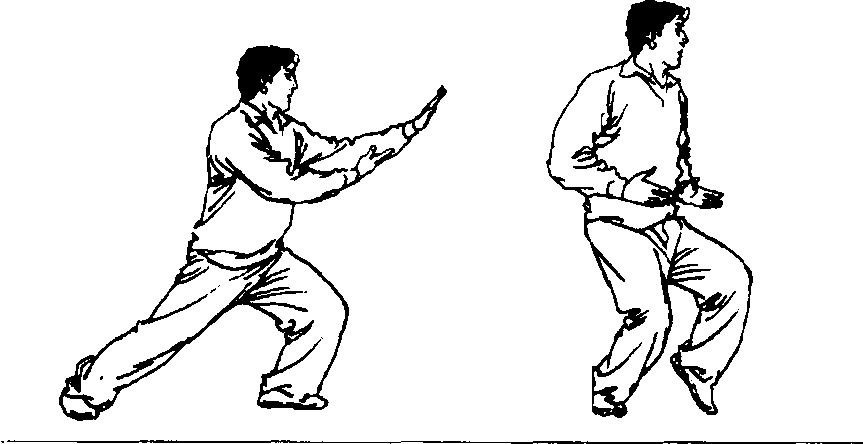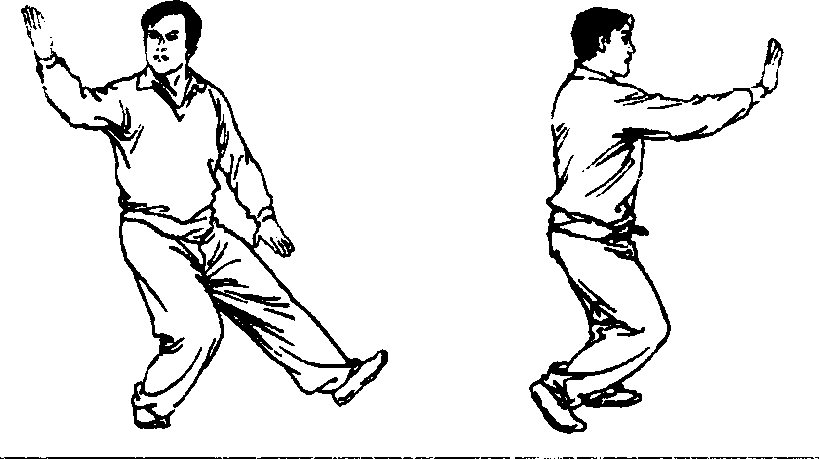 14 .右脚后退一步。左掌向前伸出,与头同高,掌心向下; 左手收至右前臂内下方,掌心向上(图251)O