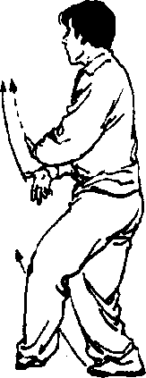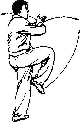 10 .重心左移,身体继续右后转至侧向前方。右腿屈膝高 提,两手交叉举抱于胸前。眼看前方(图312)。