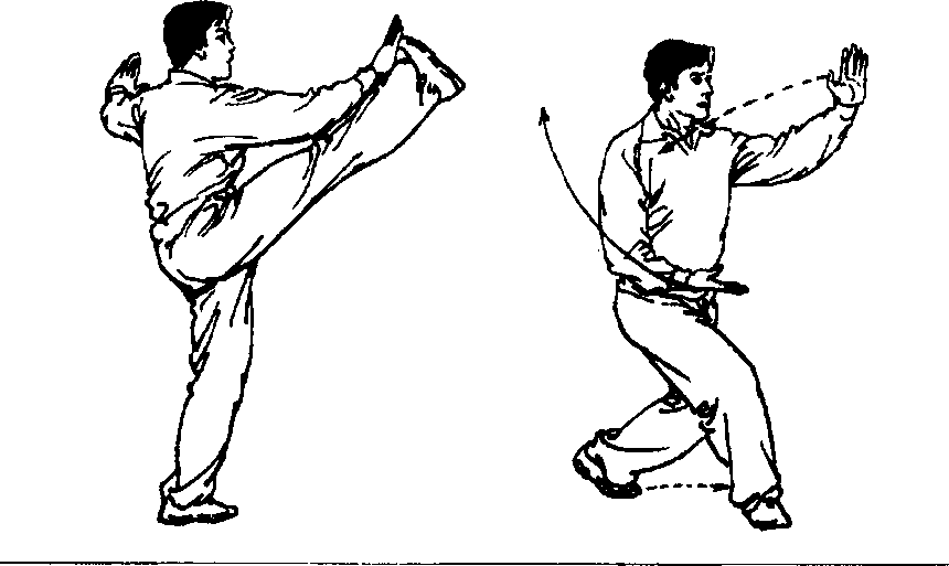 8 .左小腿向前上方摆伸,脚面尽可能展平,脚尖向前上 方踢出Q两手翻转向前后划弧分开,掌心向外,高与肩平,左臂 与左腿上下相对。眼看左手(图310)。