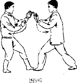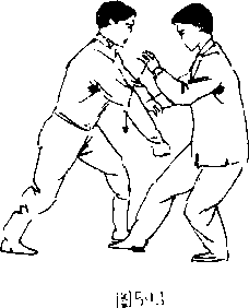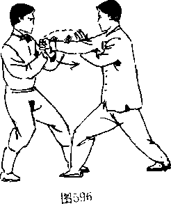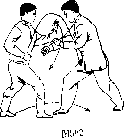 甲方右手不动,出左手从右手臂下绕过,向右.、向前再向 左划弧拨格、切而分化乙之双手。同时右拳变掌内旋裹臂,变 掌化开乙方。(图396、59力
