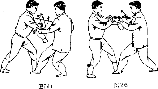 甲随后收回右拳以待击发,左手向下、向左握而拨化乙方 之拳。并身体前移,出右拳以“搬拦捶”式击向乙胸口乙迅速身 体后坐以避;双手收回,并向左、向上、向右粘而撅化甲拳。(图 594.595)