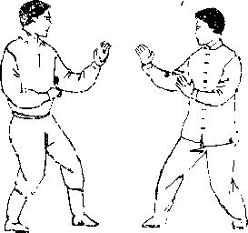,乙方身体后坐以避,并?左竽收回变招,从中间下、向左 搂拨开甲之右拳.上左脚、工右乎变拳由上至下从中以“搂膝 栽捶”式栽捶打击甲之腹部和裆部.甲立即行坐以避[(图