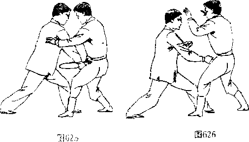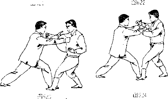 乙方受击,出左手向左拦格甲拳 ,甲7:咂其劲势,右拳向 卜栽捶乙方言部'图62KG25)C甲右吁不停,右拳内旋后从中 向前又再捶击乙方省部口 (图626)
