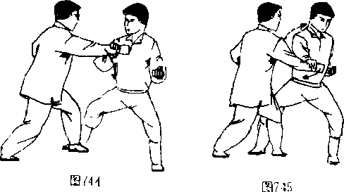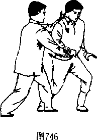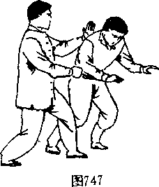 当甲方以“掩手肱捶”击向乙方,而被乙方出右手抓住甲 右手腕、向左下屐化时(图甲在乙还未出手打击前,立 即两脚前迈进身并向左转,以送右手牵制乙手再向前猛然前 伸,迫使乙方抓着甲方而身体向右转.甲又乘机出左手掌横若 橱击乙方后脑(图745,746).甲方身体右转,以腰带劲,以身 带臂左掌粘持乙头向下、向前棚击按击,右手同时下沉配合* 乙方必身体前倾而倒.(图7")