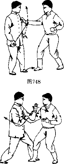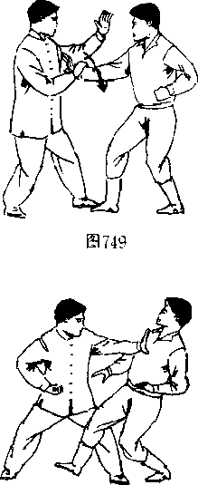 甲方站立,乙方上步出"齐抓拿甲胸口(图748),甲方立 即左脚向左前迈出,身体F沉.同时出右手抓扣住乙右手腕, 出左手立臂向上提起,从中绕过乙手,向下屈臂立掌,以手肘 部卜压乙方右手臂(图749,73⑴。随后甲方身体右拧转,右手 收拉回右腰,左手立掌(掌心向前、掌指斜向右上方)顺乙手臂 向前推按乙胸,以解脱其抓广中赏击之,(图751)