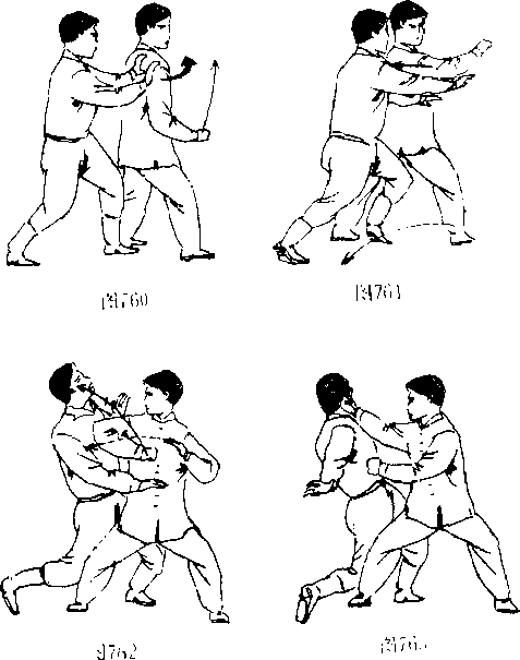 身体前倾(图76]),甲方乂乘而顺势右脚向后插步.抵绊乙 脚,身体猛然右转而回身.右手曲肘向后肘击乙方胸部(?图 762r乙方受击身沐后仰时,甲又乘势双手变拳,内合逆缠向 右,*拳撇捶乙方腹部、右拳向卜撇抻乙方头部“(图763)