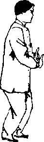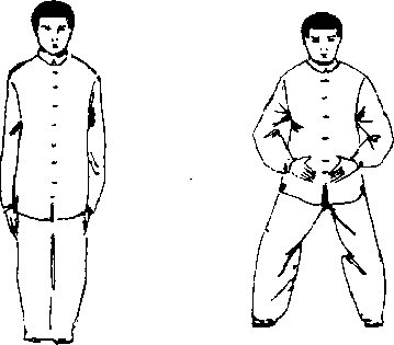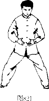 L束身导引式:身体正立放松,两脚跟并拢,足尖略外撇 (也可微两脚并拢),头正身直,虚灵顶颈,两眼微闭,眼帘卜 垂,以鼻呼吸,下颌微内收,舌抵上腭;鼻尖与肚脐成一条线, 两臂下垂,松肩活胸,两手中指轻贴于两侧裤缝,两足指内扣, 足心呼吸,呼吸自然,静心舒神,意守?丹田,(图819)