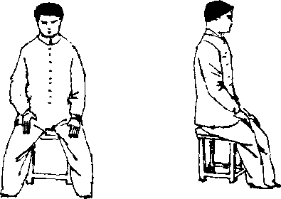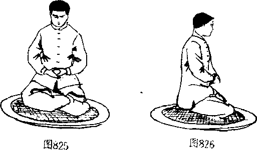 L坐于无靠背的凳子上,头、身自然端正伸直,两眼微闭, 舌顶上腭,含胸拔背,松肩垂肘,鼻尖与脐部成一条直线,塌腰 提胯,两脚屈膝,膝关节屈曲9。,两足平行,全脚掌着地(图 823,824),两膝略比肩宽或;同宽,双手自然放在两大腿上,掌 指朝前上方,掌心向下,并对“梁丘,“阳关X小指内侧))曲